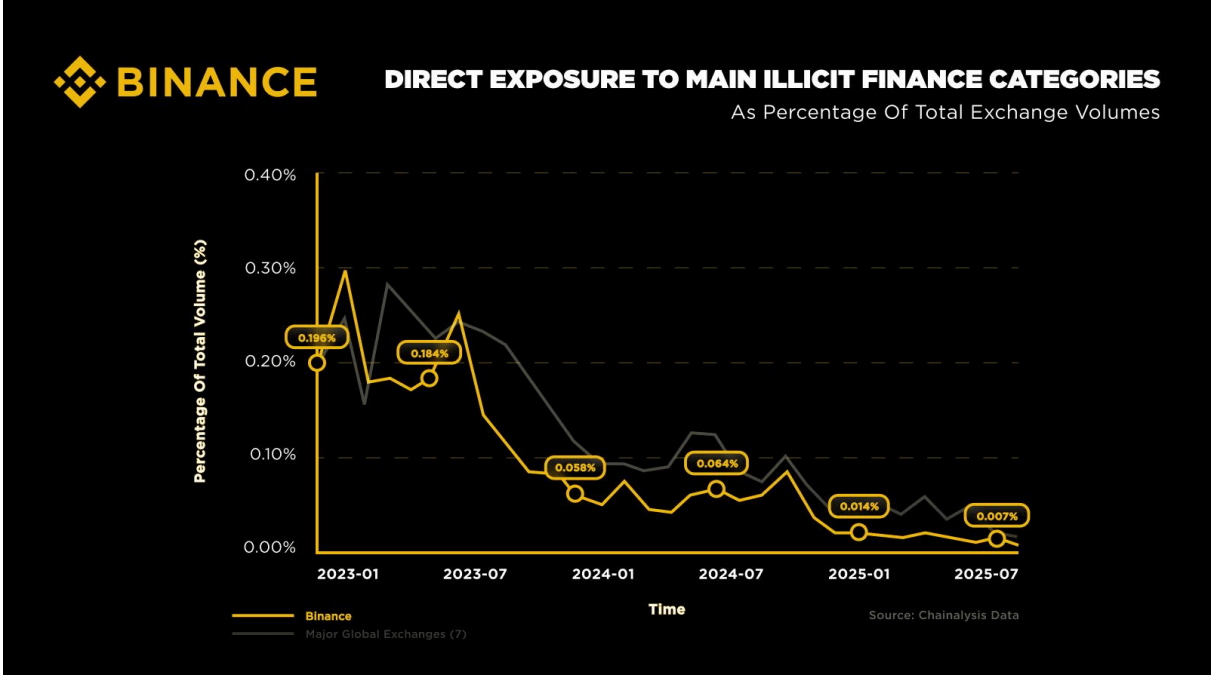 Entre jan/23 e jun/25, a Binance cortou 96–98% da exposição a fundos irregulares, superando as outras grandes exchanges por 4–5 pontos. O movimento elevou as proteções contra lavagem de dinheiro, reforçou confiança e abriu espaço para uma adoção mais segura das criptos nas finanças tradicionais.