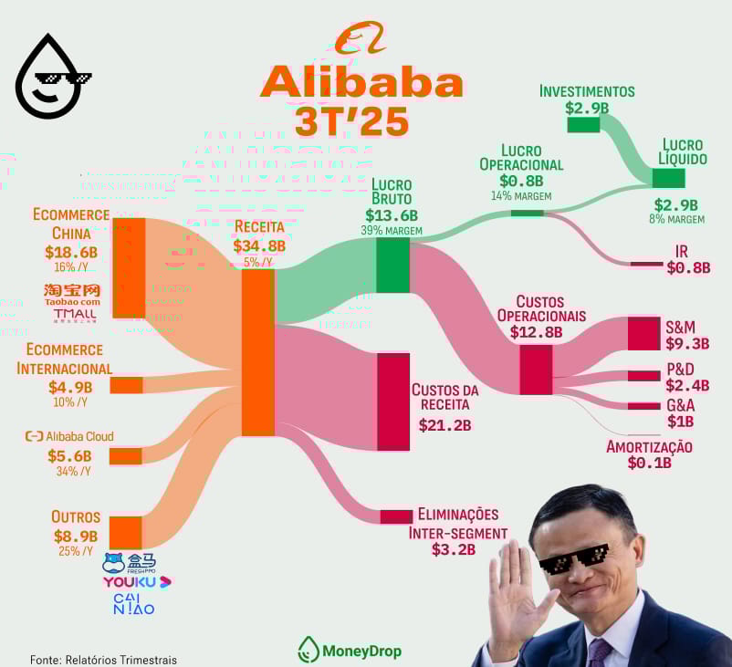 No lado menos instagramável do balanço, o lucro líquido caiu 53%, para 20,99 bilhões de yuans (US$ 2,96 bi). O lucro ajustado foi pior: -72%, para 10,35 bilhões, já que a Alibaba está torrando dinheiro para brigar no “quick commerce” da China – e cresceu 60% na área.