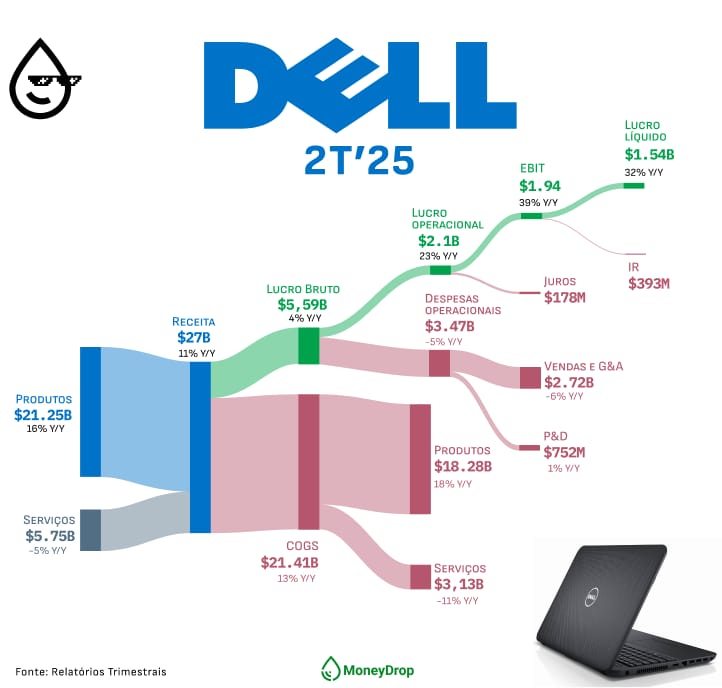 Surfando a onda da IA, a Dell também subiu sua régua: agora fala em US$ 25 bi em embarques de servidores de IA no ano (antes era US$ 20 bi) e projeta receita anual de US$ 111,7 bi.