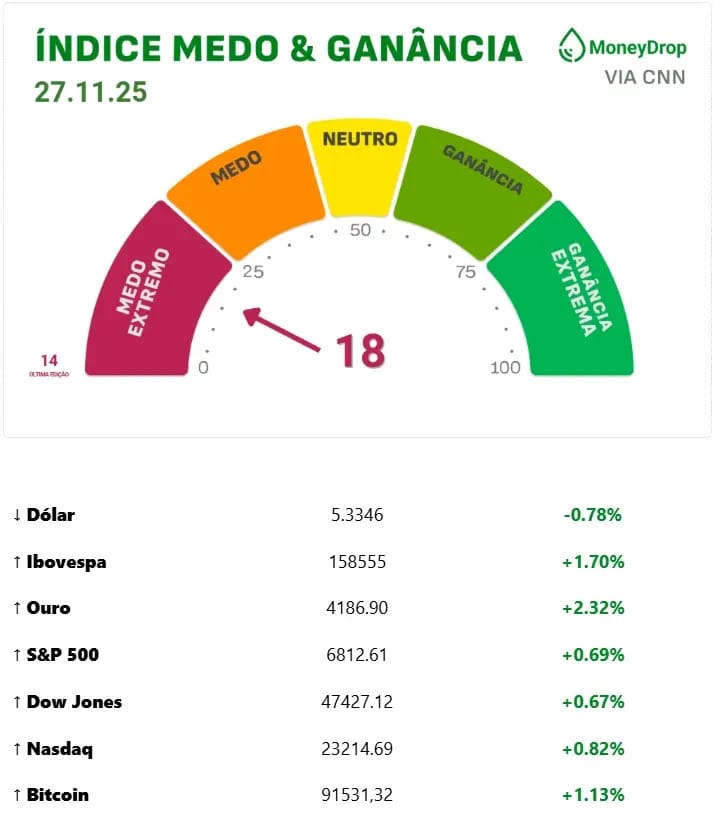Lá fora, hoje é o famoso Turkey Day Thanksgiving, então as Bolsas fecham para o feriado e o mercado todo fica em casa vendo Stranger Things e disputando a coxa do peru. As empresas de tech curtem a folga de bom humor, porque ontem o setor foi positivo e impulsionou o S&P500, que voltou a ficar acima da média móvel de 50 dias.