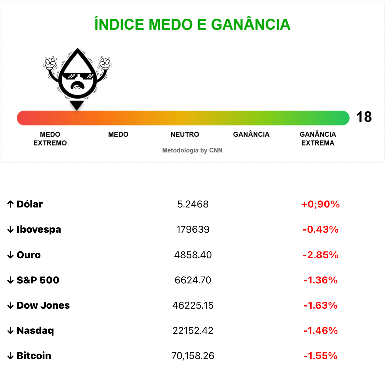 Lá fora, o dia foi de mal a pior. O pregão começou já em queda forte após dados econômicos do PPI (a inflação do produtor americano) terem chegado acima do esperado. E depois, Jerome Powell colocou mais água no chopp dos investidores ao anunciar (o que todo mundo já sabe) que o aumento dos custos de energia deve impulsionar a inflação. O Dow Jones fez a nova mínima de 2026, caminhando para seu pior mês desde 2022.