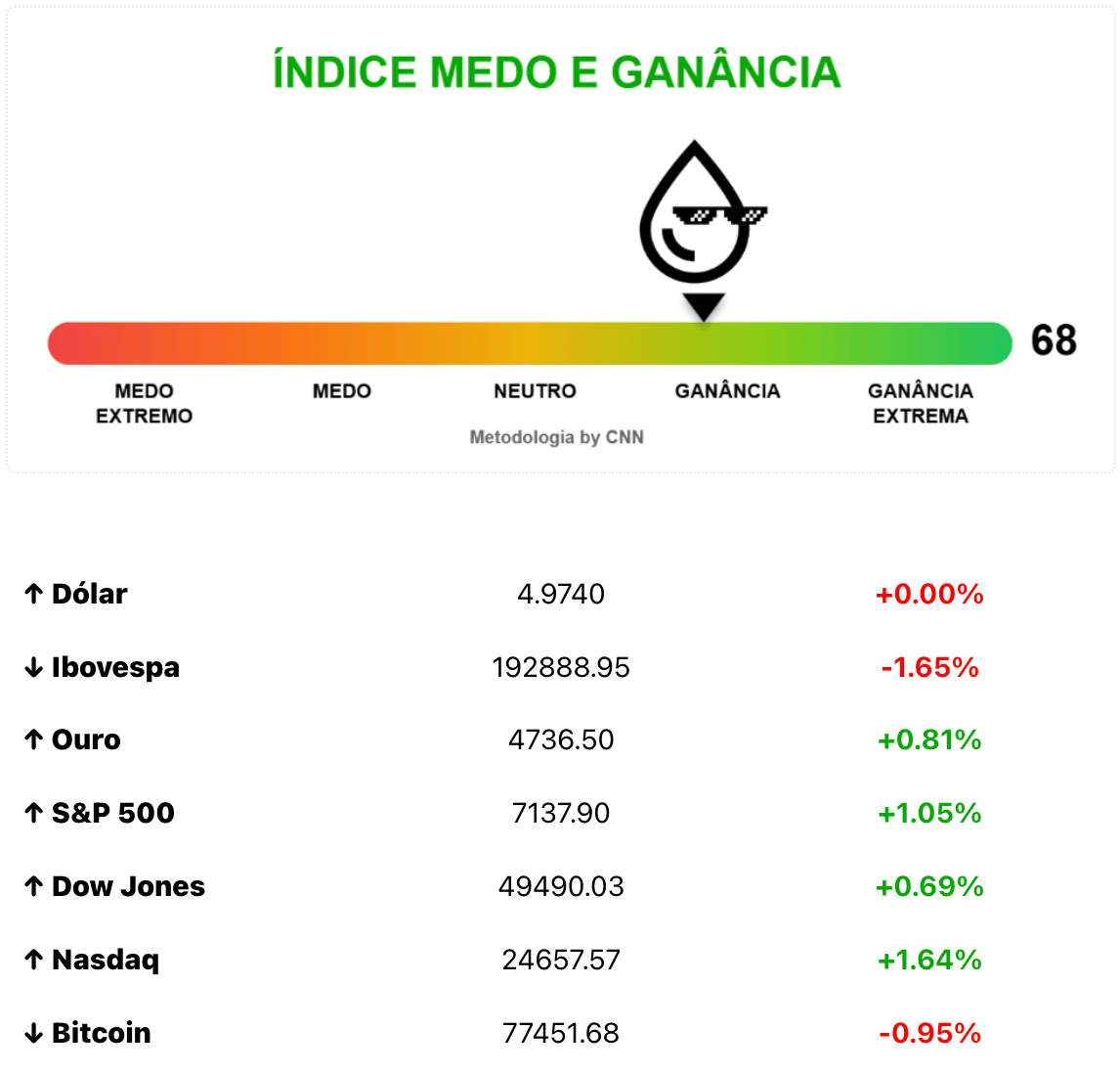 Lá fora, a extensão do cessar-fogo no Irã foi a fonte do otimismo, com tanto o S&P 500 quanto o Nasdaq 100 registrando novas máximas históricas — impulsionadas pela alta de todas as Mag-7. O petróleo também subiu, passando novamente dos US$ 100 por barril, após o Irã disparar contra três navios no Estreito de Ormuz.