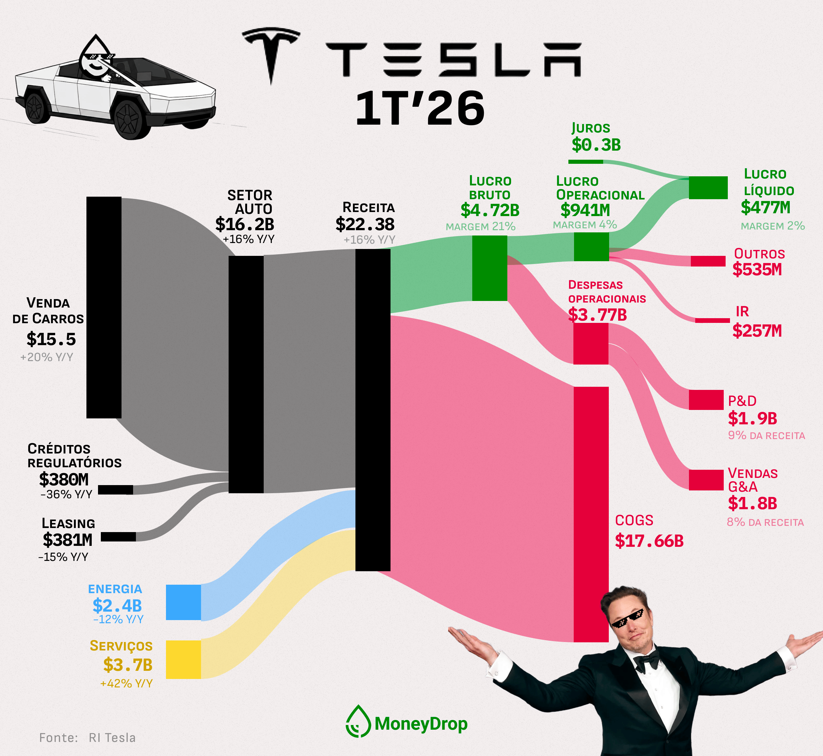 Tudo isso enquanto a empresa vai se organizando para construir cada vez mais robôs e investindo em software para os carros elétricos — assinaturas do sistema de direção assistida (o famoso FSD) já passam de 1,28 milhão, crescendo forte.