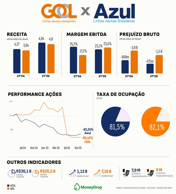 Na teoria, a união fazia sentido e a expectativa era de sinergias, cortes de custos e balanços mais equilibrados. Na prática, cada uma voa em ritmo próprio: a Gol saiu do Chapter 11 nos EUA para levantar caixa e reativar aviões parados, enquanto a Azul entrou no processo para devolver aeronaves e cortar 35% da frota.