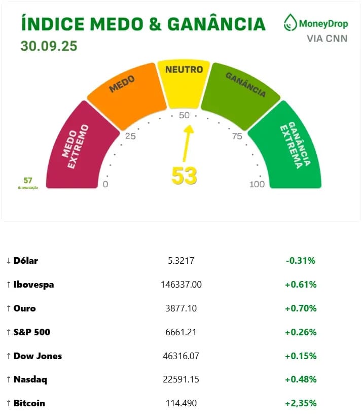 Lá fora, essa semana vai ser bem movimentada com a possível paralisação do governo e também com os dados do Payroll, o mercado de trabalho americano. Ontem os índices subiram, com as empresas de IA recuperando um pouco as perdas da semana passada. O ouro bateu um novo recorde, quebrando a barreira dos US$ 3.800 a onça. Amanhã vamos ter divulgação da Nike.