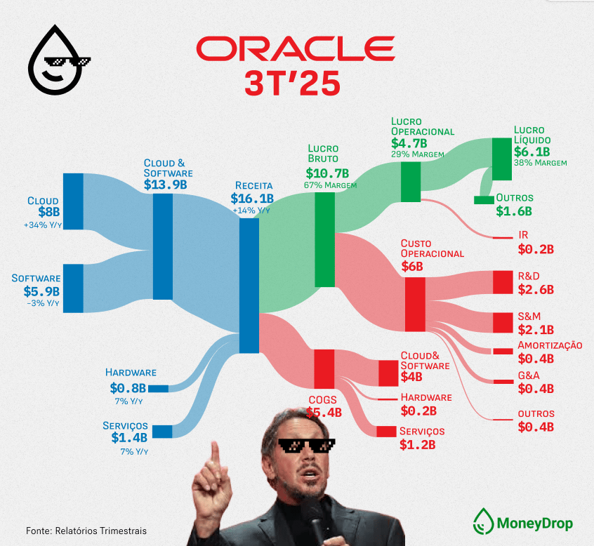 A receita futura contratada disparou +438%, chegando a um surreal US$ 523 bilhões. Segundo o CFO Doug Kehring, o salto vem de novos compromissos com ninguém menos que Meta, Nvidia e companhia. Com isso, a Oracle já projeta cerca de US$ 4 bilhões extras pingando em 2027.