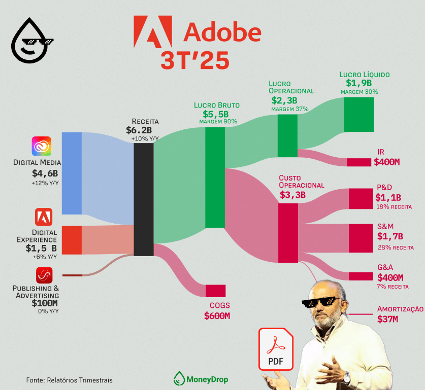 Mas o mundo criativo não vive só de filtro bonito. A concorrência subiu a régua, com novas IAs pipocando e mirando contratos que sempre foram da Adobe. Pra não perder terreno, a empresa até botou o pé no mundo do marketing digital e anunciou a compra da Semrush por US$ 1,9 bi.
