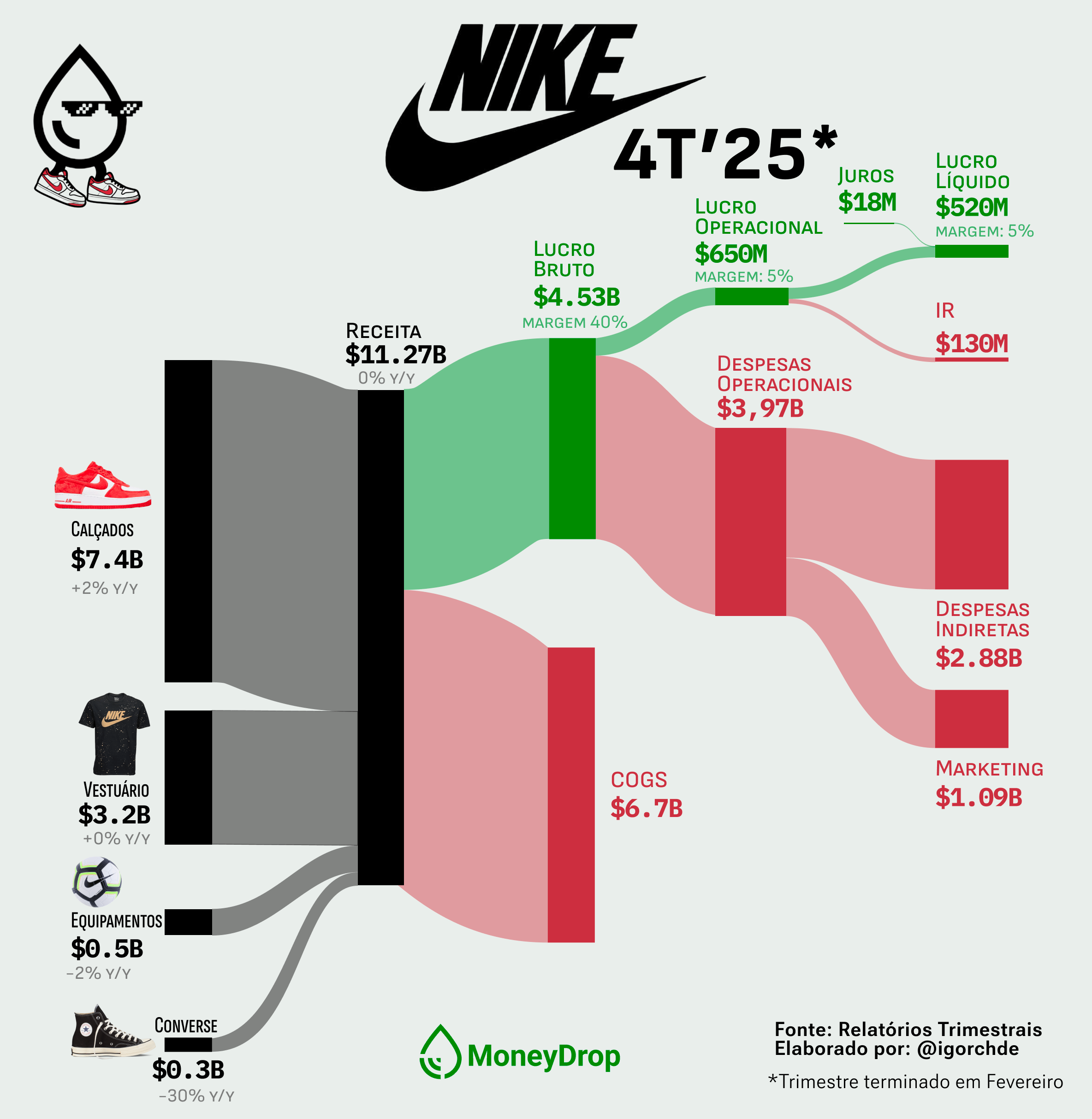 A Nike já vinha de um processo de recuperação quando entrou em cena o combo nada amigável para as vendas: guerra comercial, inflação e tensão geopolítica no Oriente Médio, que pode encarecer ainda mais energia e frete.