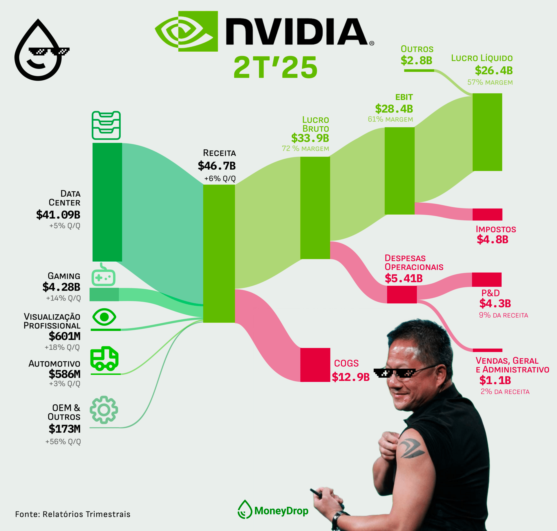 O guidance para o próximo trimestre promete US$ 54 bilhões de receita, esperando abastecer data centers de Microsoft, Amazon, Alphabet, Meta e OpenAI. O CEO Jensen Huang estima que as big techs vão gastar US$ 3-4 trilhões em IA nos próximos anos e que a Nvidia pode abocanhar até 70% desse montante.