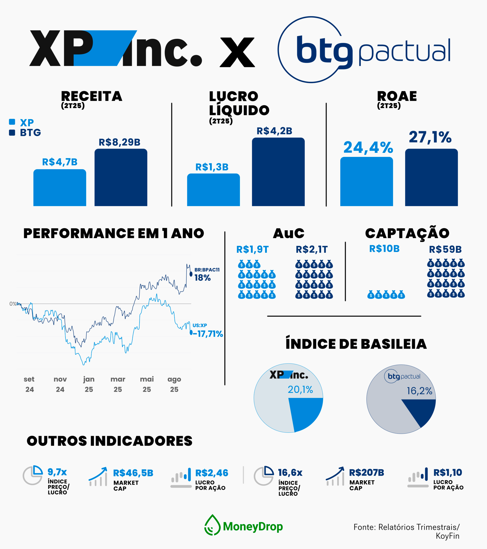BTG e XP seguem como protagonistas do mercado financeiro brasileiro, mas com particularidades. O BTG se destaca pelo lucro robusto e diversificação de frentes, enquanto a XP quebra recorde de lucro e mantém o varejo como fortaleza — ainda que tenha mostrado crescimento tímido e captação bem abaixo da meta.